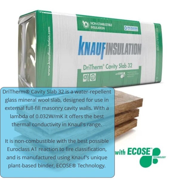 Knauf DriTherm Cavity Slab 32 is a water-repellent Glass Mineral Wool slab, designed for use in external full-fill masonry cavity walls, that offers the best thermal performance.. It is non-combustible with the best possible Euroclass A1 reaction to fire classification, and is manufactured using Knauf Insulation's unique bio-based binder, ECOSE Technology. Statutory Features and benefits Excellent thermal performance. Made with ECOSE Technology which does not contain any added phenol or formaldehyde. Products made with ECOSE are soft to touch, they generate low levels of dust and low VOCs. Non-combustible Euroclass A1 Reaction to Fire classification rating. Manufactured using a water repellent additive. Slabs are sized to fit between wall ties without the need for retaining discs.